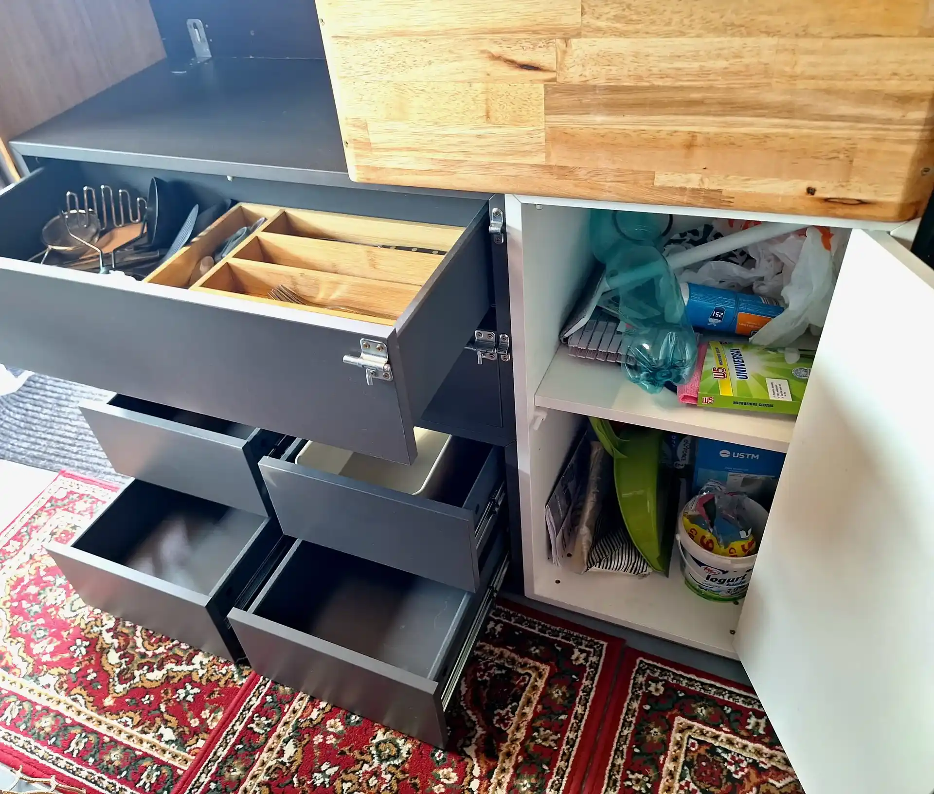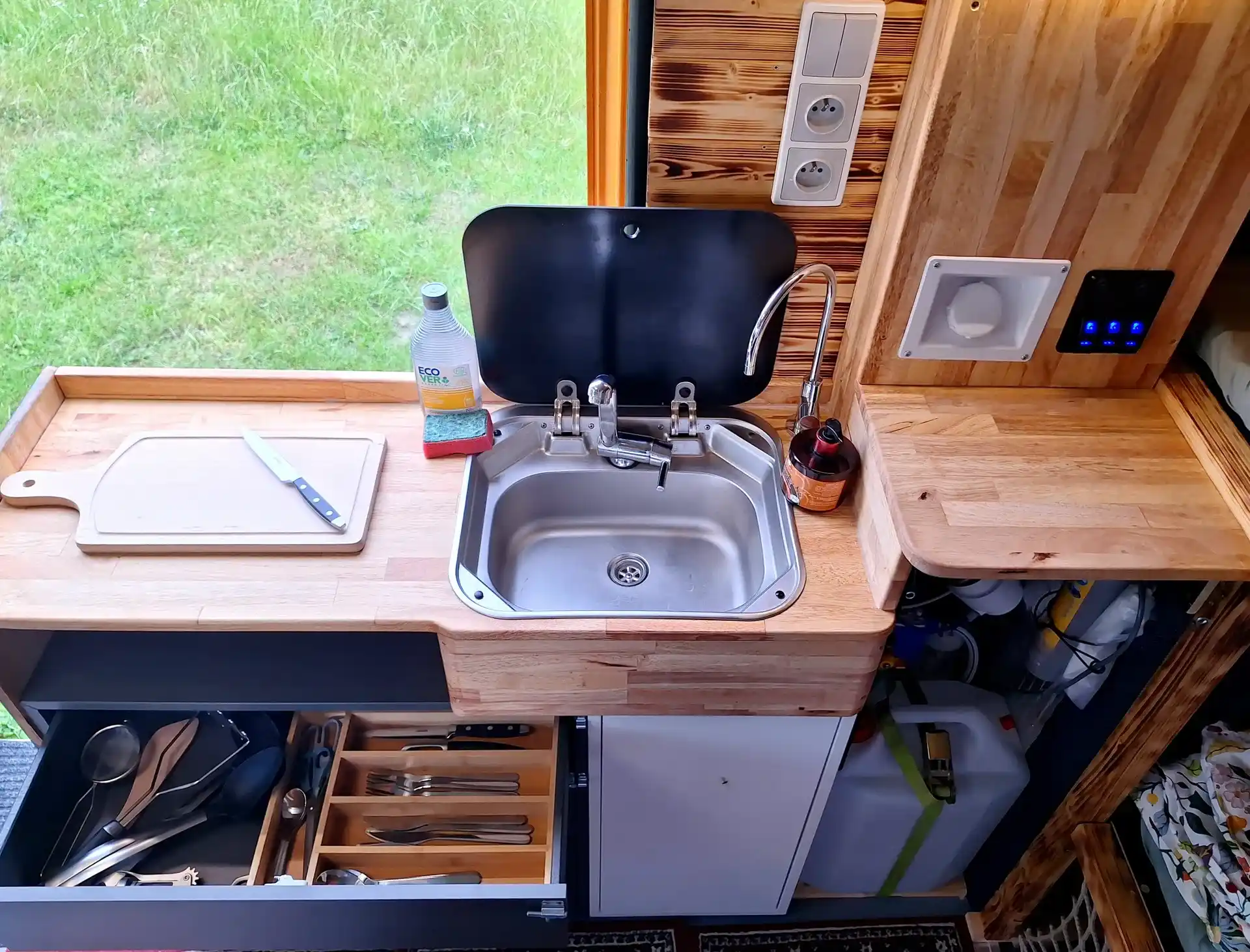 - Vodu ze dřezu můžete pomocí kohoutů pustit pod auto, nebo do 20L kanystru pod linkou
