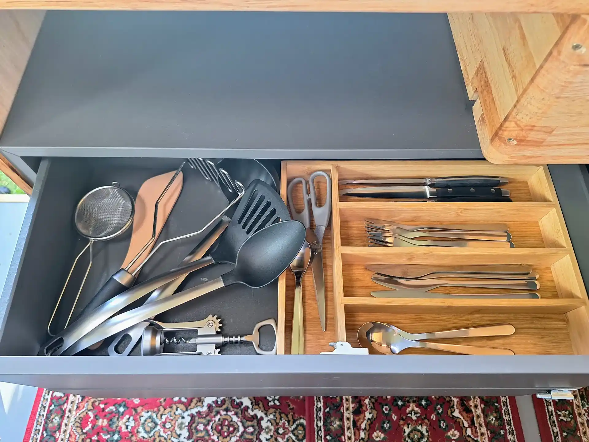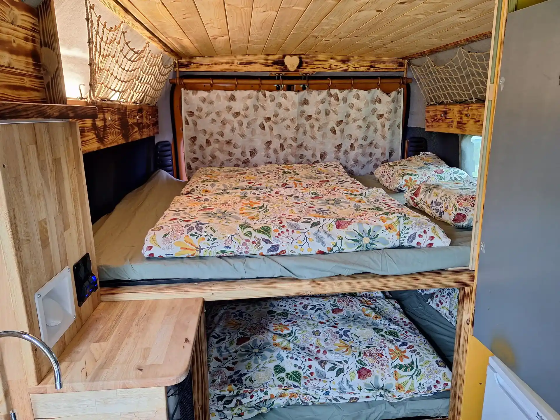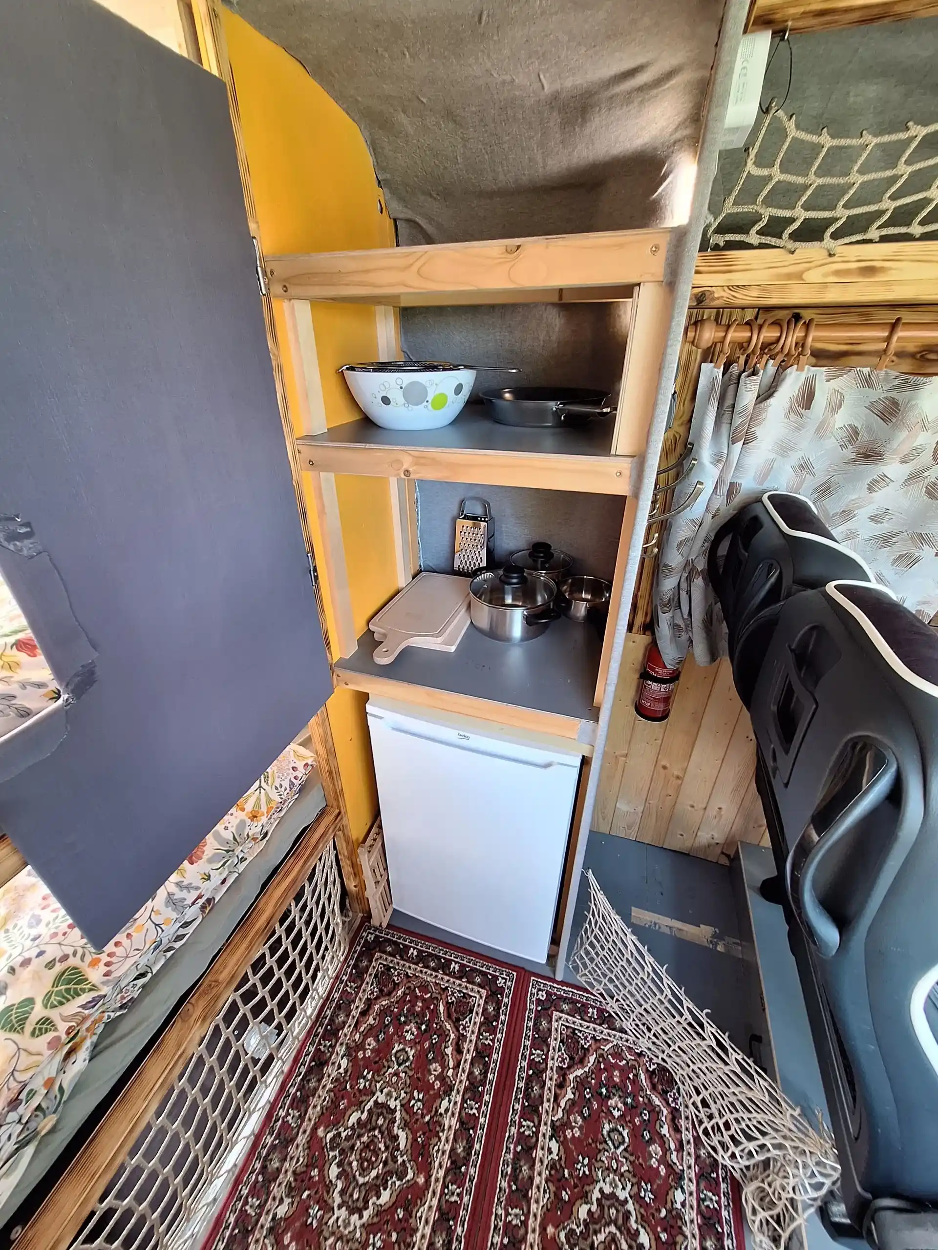 Nemá koupelnu, a to záměrně – tím mezi kuchyní a postelí vznikl prostor, který v běžné obytce nenajdete (na převlékání, vaření, postávání, čištění zubů,…).
