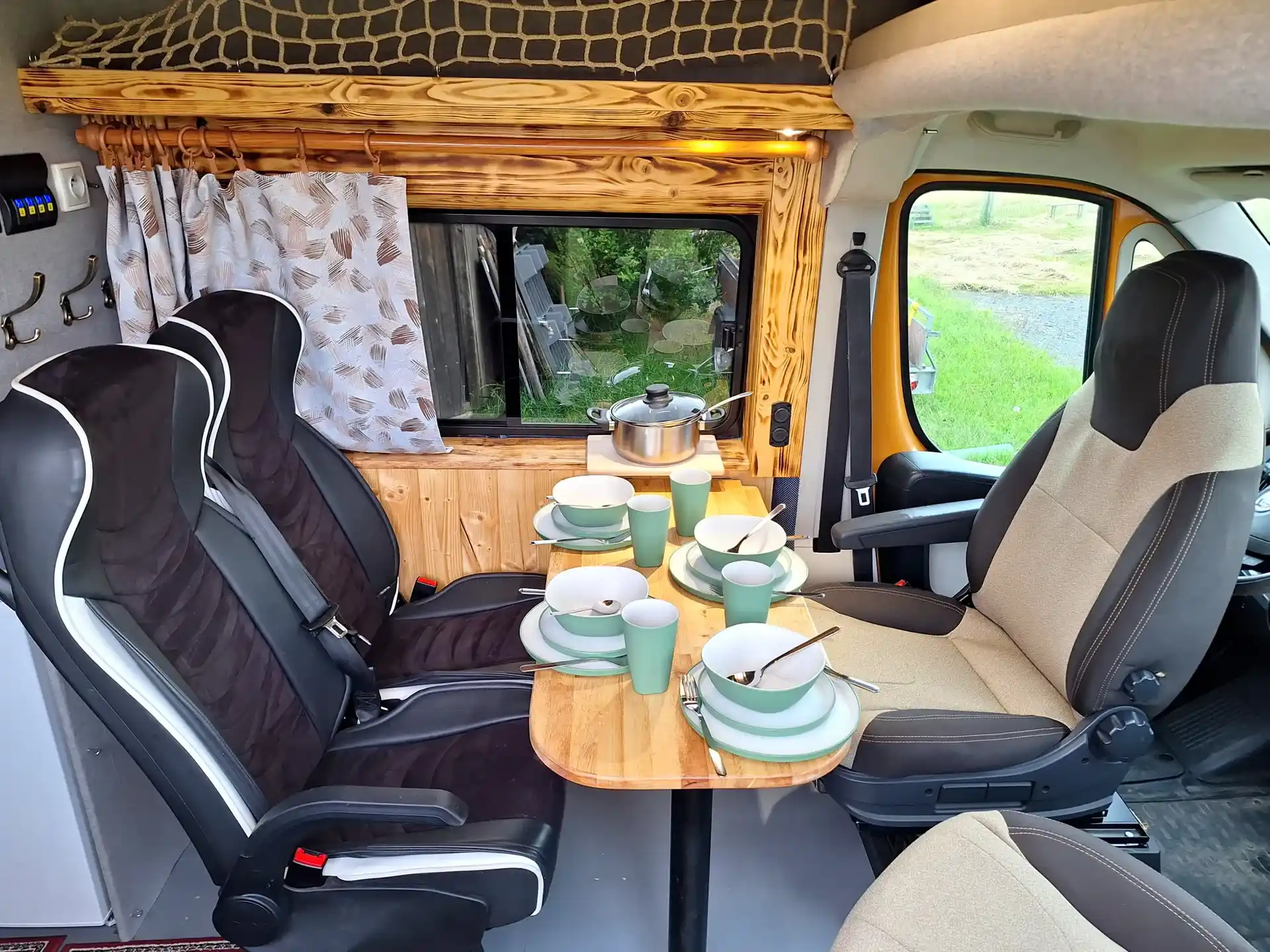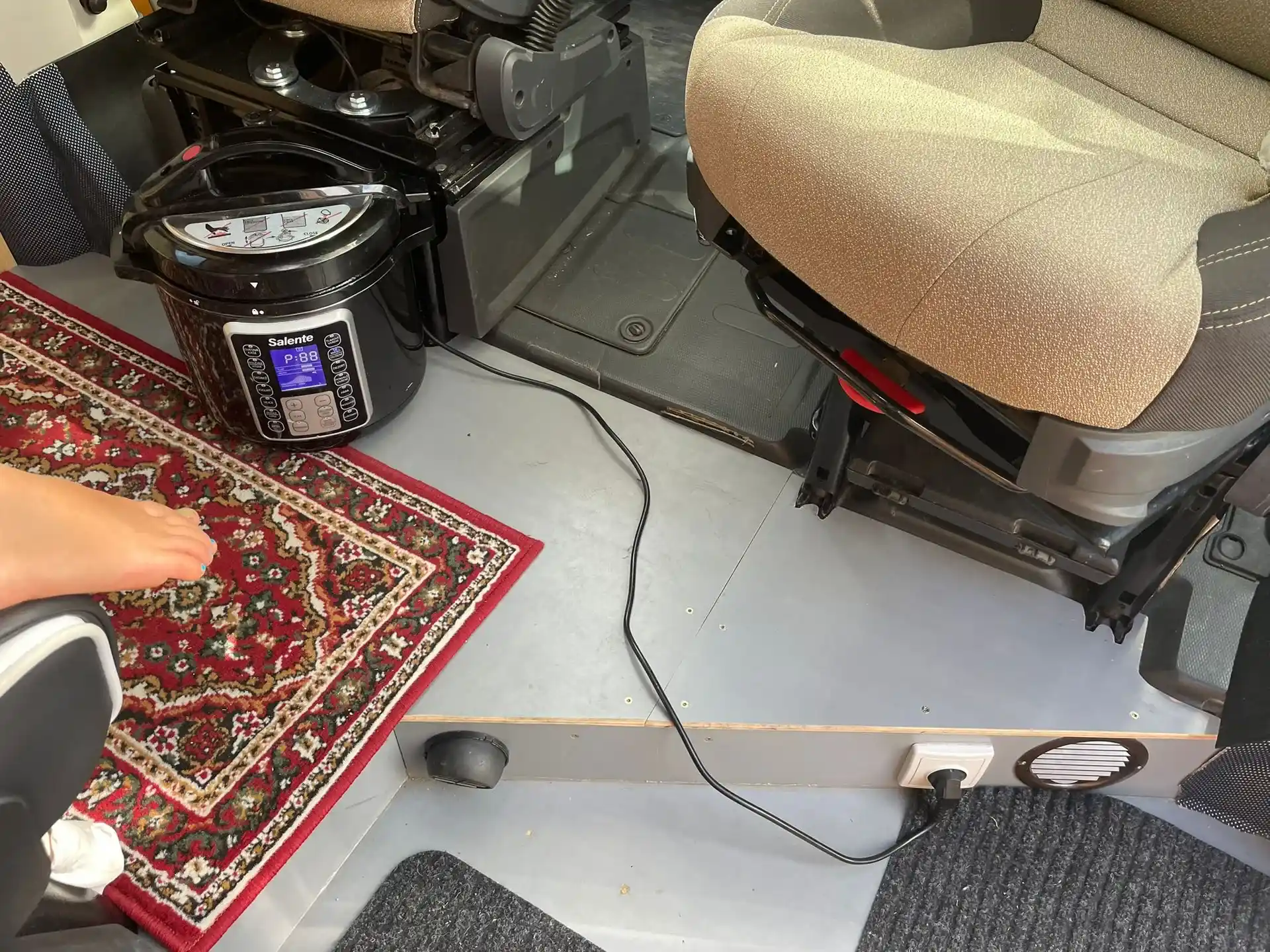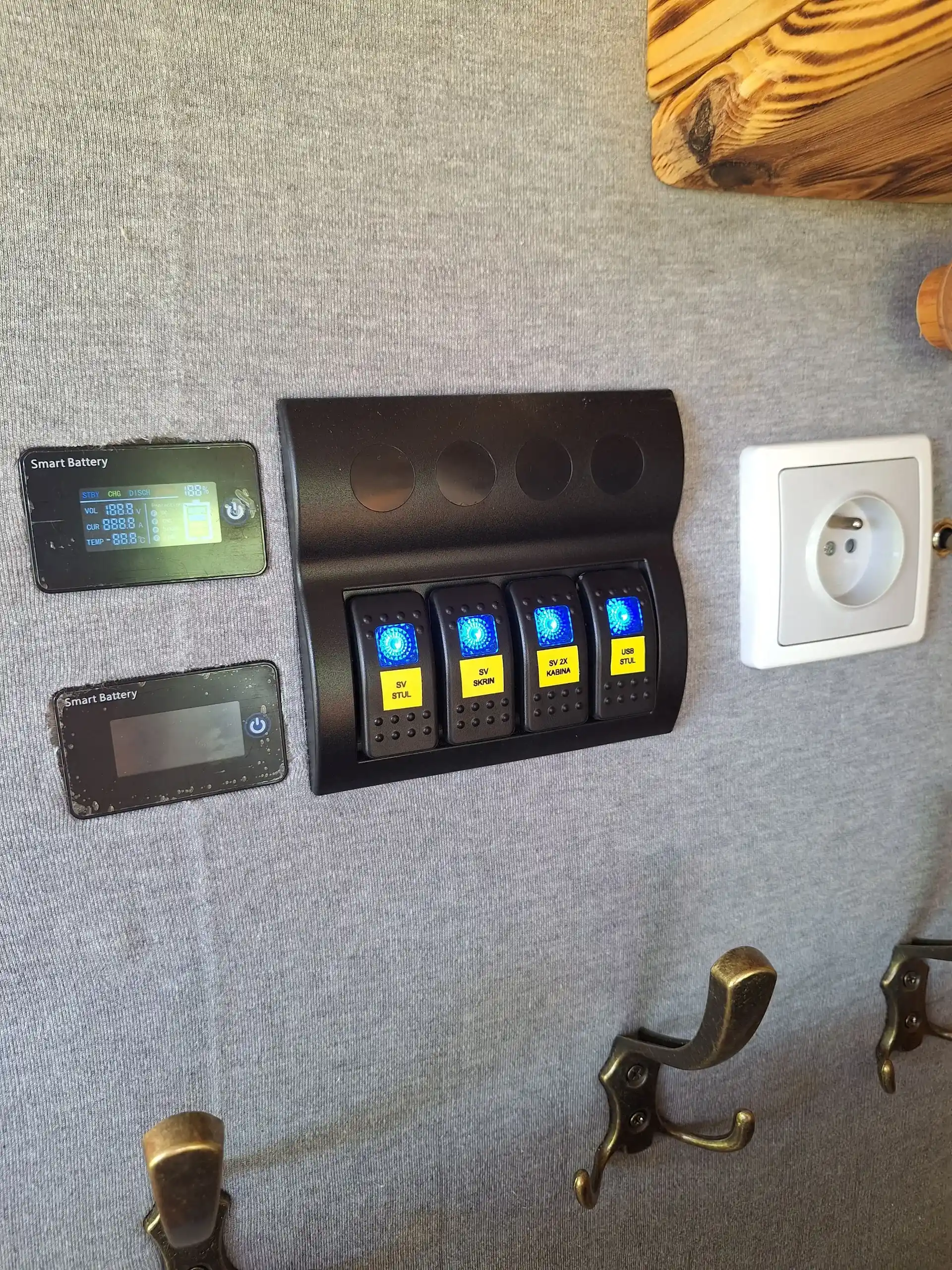 1. Velkou fotovoltaickou elektrárnou (cca 800Wp), která zajišťuje nabíjení přídavné palubní 5kWh baterie. Dobíjení probíhá i za jízdy z alternátoru vozidla. Díky tomu je možné plně používat rychlovarnou konvici a elektrický tlakový hrnec na vaření.